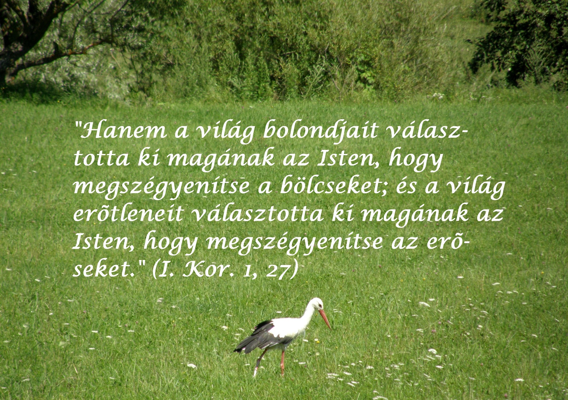 "Hadd mondjak el most egy példázatot! Hívjuk hősünket Jánosnak. János egy nagy kétemeletes házban lakik, emeletenként öt-öt szobával. Egy nap udvarias kopogást hallott a bejárati ajtón. János kinyitotta, és lám, Jézus állt az ajtó előtt. "Ó, Jézus! Fáradj be, kérlek! - mondta János, a házam legszebb szobáját adom neked - az emeletit." Nos, Jézus úriember, így azt mondta: "Köszönöm."